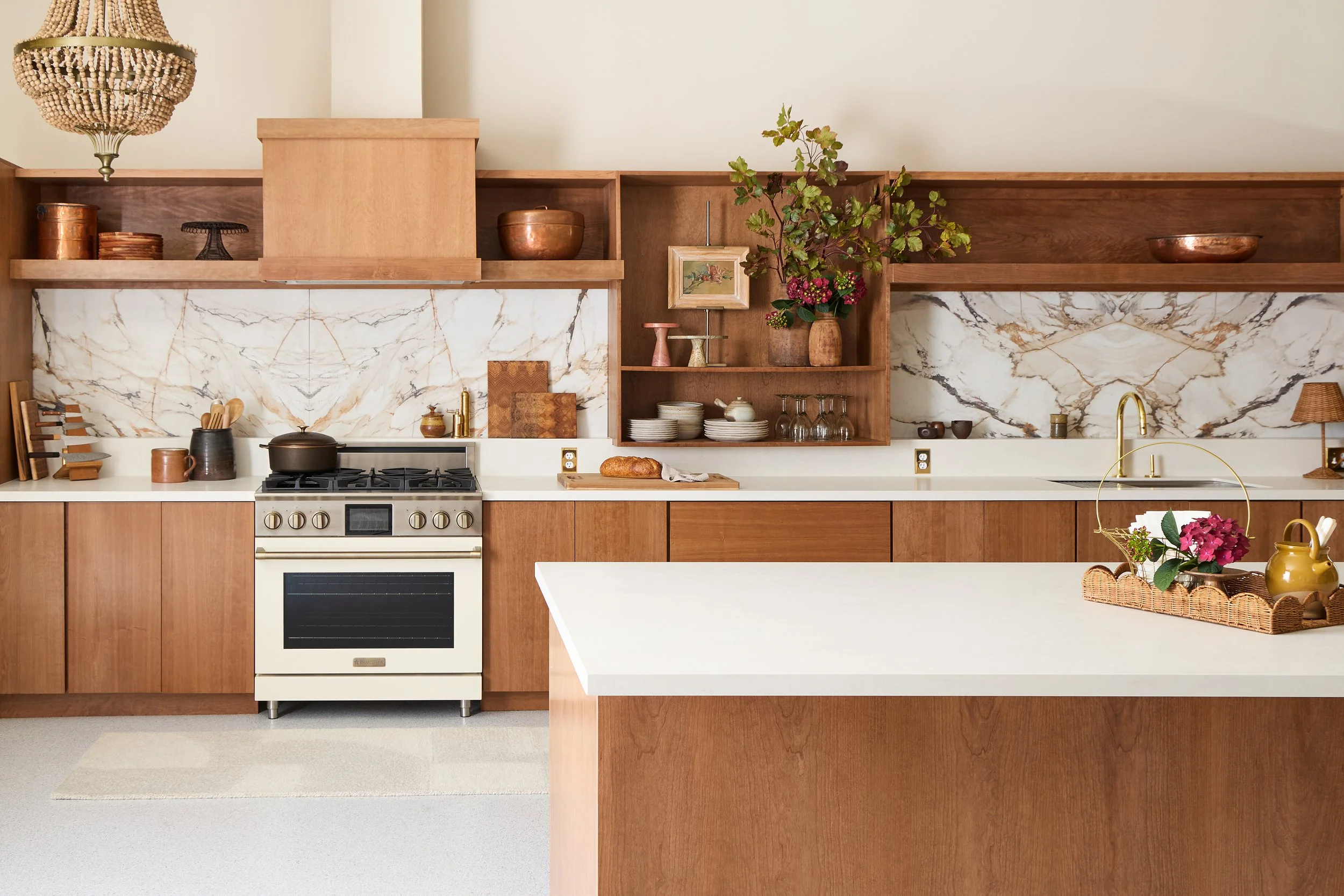 What truly sets this kitchen apart is its adaptability: the mobile island on wheels can be spun around or swapped out for a kitchen table, allowing you to easily adjust the layout for different setups. The Interchangeable Backsplash System enables you to refresh the entire look by swapping out tiles or wallpapers, ensuring a fresh aesthetic for every shoot. With a dual-fuel, six-burner oven, modern culinary workspace sink, and custom wood cabinetry, it offers a versatile foundation for culinary projects of all kinds. Designed for real-time food preparation and staging, this kitchen seamlessly combines beauty and functionality. With its beautiful, yet subtle design, this space invites creativity and ensures your projects always feel new, while making it easy to return and keep your shoots feeling fresh.